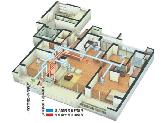 新风系统是一套独立空气处理系统,新风系统将室外新鲜空气经过净化,通过管道送到室内,同时将室内污浊、含氧量低的空气排出室外。在室内会形成“新风流动场”的原理,从而满足室内新风换气的需要。实施方案是:采用高压头、大流量小功率直流高速无刷电机带动离心风机、依靠机械强力由一侧向室内送风,由另一侧用专门设计的排风新风机向室外排出的方式强迫在系统内形成新风流动场。在送风的同时对进入室内的空气进新风过滤、灭毒、杀菌、增氧、预热(冬天)。排风经过主机时与新风进行热回收交换,回收大部分能量通过新风送回室内。借用大范围形成洁净空间的方案,保证进入室内的空气是洁净的。以此达到室内空气净化的目的。